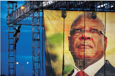 欧盟向马里增派27名观察员监督第二轮总统选举投票。8月9日,在马里首都巴马科,一名工人在马里联盟党总统候选人易卜拉欣·凯塔的巨幅海报旁为竞选活动搭建舞台。 新华社发