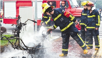 摩托车行驶中起火烧成空壳。 何文斌 徐璐雅 摄