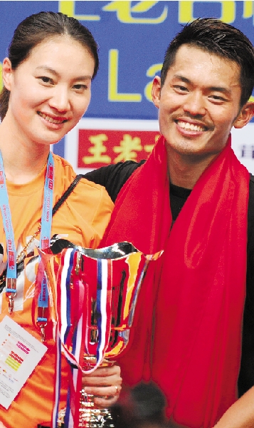 8月11日,林丹(右)和妻子谢杏芳在颁奖仪式上。 新华社发