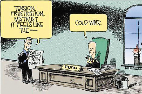 图左一名高官手拿文件(上面写着“奥巴马取消了与普京的峰会”)说:“紧张。挫折。猜疑。这感觉像是……”坐在一旁的俄罗斯总统普京接过话茬:“冷战。” (原载美国报刊漫画家协会网站)