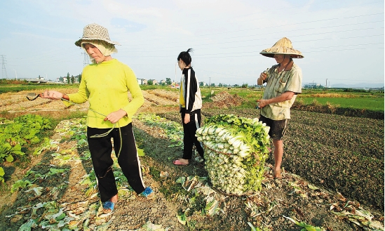 8月11日下午,菜农们正在绍兴租种的蔬菜地里劳作。受持续高温的影响,许多蔬菜已被烤焦。 李瑞昌 摄
