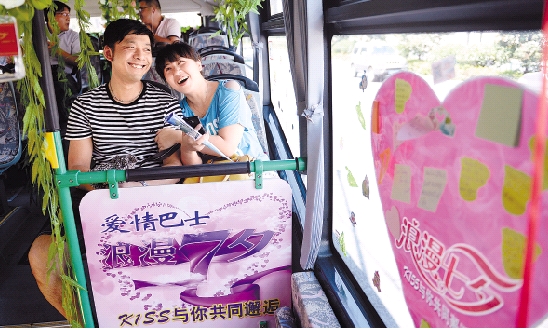 8月13日,杭州K155路公交车载着浓浓爱意穿行在马路上。K155路车头电子屏“K155”形似英文“KISS”,被推崇为杭城最浪漫巴士。