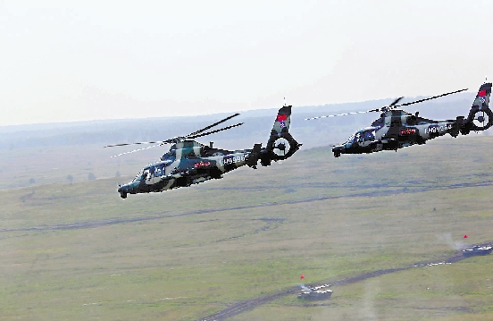 8月15日,在俄罗斯切巴尔库尔合同训练场,中方陆军航空兵编队低空进入实施打击。 新华社发(线云强 摄)