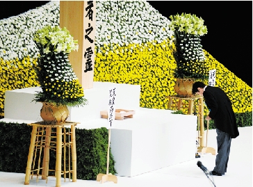 8月15日,安倍晋三在日本东京武道馆向战死者献花默哀。 新华社发