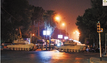 8月14日,在埃及首都开罗,两辆坦克在宵禁期间封锁街道。 新华社发