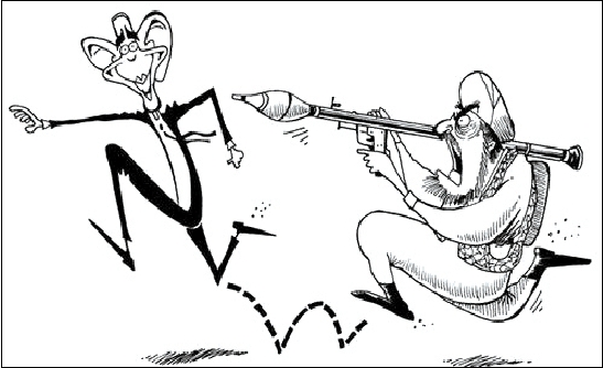 一名扛着便携式武器的恐怖分子正追着美国总统奥巴马跑。奥巴马说:“瞧见没?我告诉过你们‘基地’组织正在逃跑。”“逃跑”这一英文词组也有“忙碌”的意思。 (原载美国报刊漫画家协会网站)