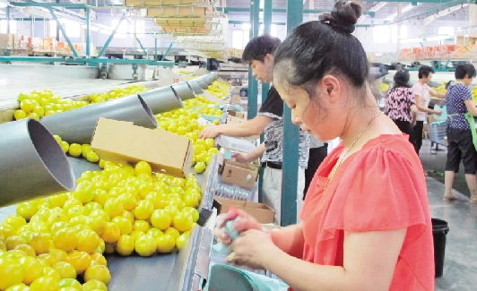 近日,浙江天子果业有限公司的水果装配车间一片忙碌景象。图为工人们正在把新近采自公司云南果业基地的高品质柑橘分拣装箱,出口加拿大。 严慧 摄