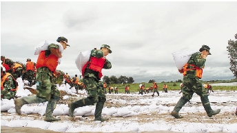 8月18日,在黑龙江省黑河市逊克县干岔子乡,官兵在背送沙袋处置管涌。 新华社发 (王齐胜 摄)