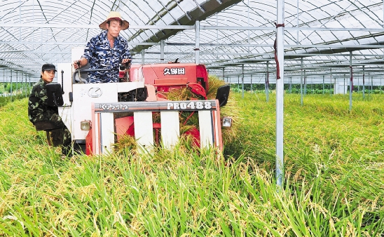 8月18日下午,舟山定海喜来岛农业开发有限公司员工正在收割种植在草莓大棚内的早稻。据介绍,草莓大棚水旱轮作,能有效减少土壤中的病菌,从而提高草莓品质。
