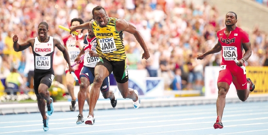 | 8月18日,在田径世锦赛男子4x100米接力决赛中,牙买加队以37秒36的成绩夺得冠军。图为牙买加男队第四棒选手博尔特(右二)在比赛中冲过终点。中国男女队均未进入4x100米接力决赛。 新华社发 |