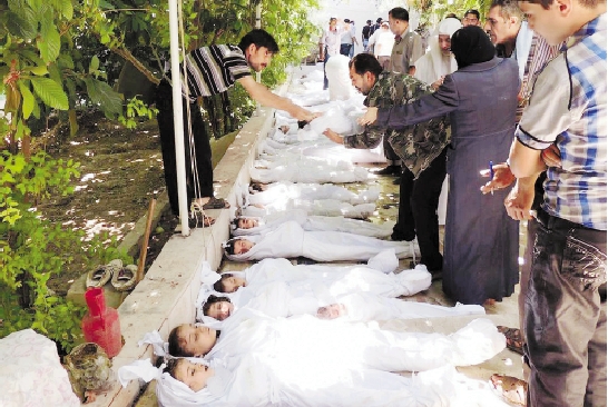 8月21日,在叙利亚首都大马士革的杜马镇,人们辨认遇难者遗体。 新华社发