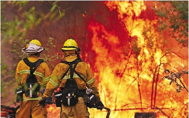 8月21日,两名消防员站在被大火吞噬的森林前。美国加州约塞米蒂国家公园附近的大火持续肆虐,威胁到公园外2500户居民的安全。 新华社发