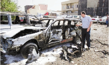 8月22日,在伊拉克北部城市基尔库克,一名男子查看爆炸现场。基尔库克市中心区域当天发生一起汽车炸弹袭击,造成两名警察和两名平民受伤。 新华社发