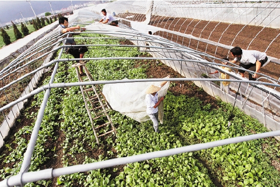 8月23日下午,在温州莱源农产品专业合作社里,农民正在更换被台风掀掉的大棚薄膜。“潭美”过后,当地群众迅速展开自救,减少损失。 陈晓彬 叶晓东 摄