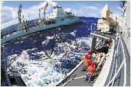8月30日,洪泽湖舰补给装置滑向青岛舰接收装置。 新华社记者 查春明 摄