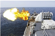 中国海军哈尔滨舰主炮进行“对海攻击”。 新华社记者 饶饶 摄
