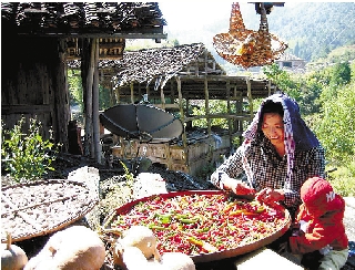 秀珍在阳光下筛选辣椒。 吴晓鹏 摄