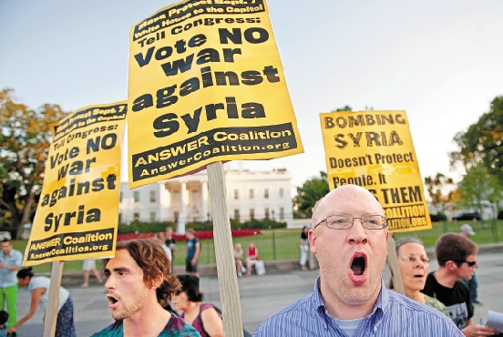9月3日,民众在美国华盛顿白宫前抗议政府干涉叙利亚问题。 新华社发