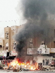 9月3日,伊拉克首都巴格达什叶派聚居地发生多起汽车炸弹袭击,造成至少40人死亡、100多人受伤。图为当日在巴格达街头,浓烟从一辆发生爆炸的汽车冒出。 新华社发