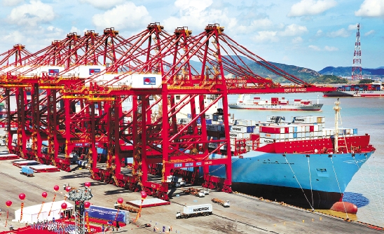 8月中旬,装载量达1.8万标准箱的巨无霸集装箱船“美杰马士基”轮停泊在宁波港穿山码头。 胡建华 龚林浩 摄