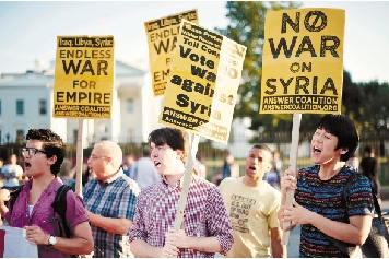 9月3日,民众在美国华盛顿白宫前抗议政府干涉叙利亚问题。美国媒体3日公布的最新民调结果显示,近六成美国民众目前反对美国政府对叙利亚采取军事行动。 新华社发