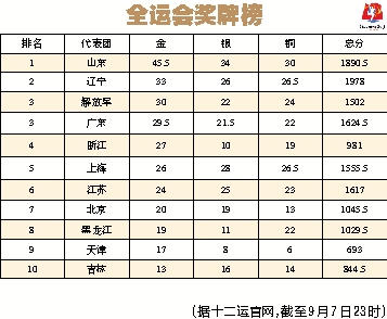 | 10 | 吉林 | 13 | 16 | 14 | 844.5 |