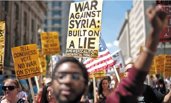 9月7日,上百名示威者7日在华盛顿的白宫和国会门口举行游行示威活动,抗议美国总统奥巴马军事打击叙利亚的计划,要求国会否决他的动武申请。 新华社发