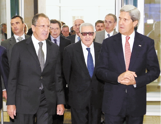 9月13日,抵达瑞士日内瓦万国宫的美国国务卿克里(右)和俄罗斯外交部长拉夫罗夫(前左)在联合国—阿盟叙利亚危机联合特别代表拉赫达尔·卜拉希米(中)的陪同下前往会场,准备就叙利亚化学武器问题进行第二日会谈。