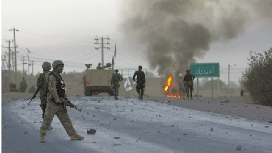 9月13日,在阿富汗赫拉特省的美国领事馆附近,安全人员在路边警戒。
