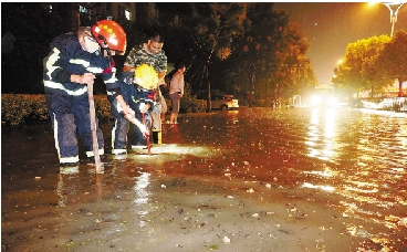 天目山路西段积水严重,杭州市消防支队留下中队接警后,迅速赶到积水最深的路段。把一个个被大水淹没的排水窨井盖打开,使排水得以通畅。一名消防员还不停地用手清理被水冲过来的杂物。 本报记者 吴煌 摄