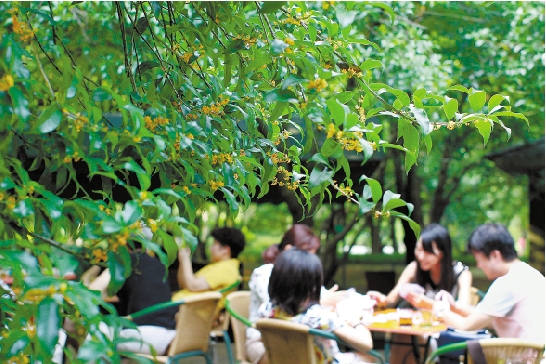 9月14日,连日来的“桂花蒸”天气催开了杭州植物园的桂花,杭州黄、晚馨、丹桂、早银桂等同时绽放,引来游人在桂花树下赏桂品茗。 本报记者 魏志阳 摄