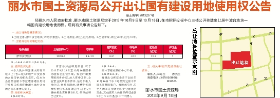 经丽水市人民政府批准,丽水市国土资源局定于2013年10月9日至10月18日,在市招标投标中心三楼公开挂牌出让原中波台地块一幅国有建设用地使用权。现将有关事项公告如下: