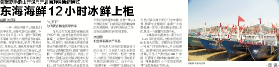 白天还在东海里面活蹦乱跳的海产,晚上就出现在杭州百姓的餐桌上,这样神奇的事情已成为可能。经由浙江日报和象山开渔节组委会的牵线搭桥,中国水产城与杭州联华华商集团签约,推出“渔满中秋 一网情深”主题活动。现在,分布杭州各城区的世纪联华超市大型门店完成“12小时冰鲜采购”,即在12小时内完成海鲜上岸后直发杭州世纪联华超市销售,这样一来,杭州市民在家门口就能品尝到最新鲜的东海海鲜。活动内容除此之外,还有送温情进杭州百姓家等。