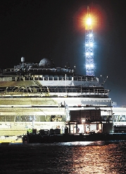 图为意大利吉利奥港口看到的扶正后的触礁游轮(9月17日摄)。经过19小时的打捞作业,去年1月在意大利吉利奥岛附近触礁搁浅倾覆的游轮“科斯塔·康科迪亚”号终于再现全貌。