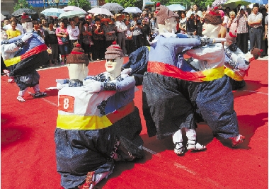 连日来,磐安县举行庆祝复县30周年系列民俗文化活动。图为该县新渥镇中卢村农民表演折子戏《大力士摔跤》。 叶寒青 吴警兵 卢伟星 摄