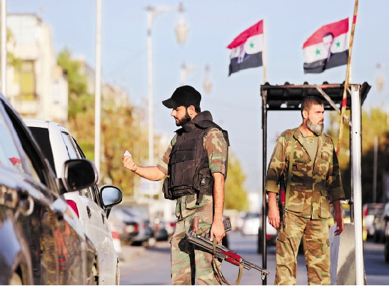 9月18日,叙利亚大马士革郊区,政府军士兵在检查站检查车辆。 视野网供图