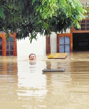9月19日,在越南中部广治省,一名当地居民在洪水中游泳前行。当日,南海热带低压在越南中部沿海登陆,越南中部的广治省、广南省、岘港等几个省市出现暴雨天气,造成至少2人死亡,12人失踪,许多房屋被淹。