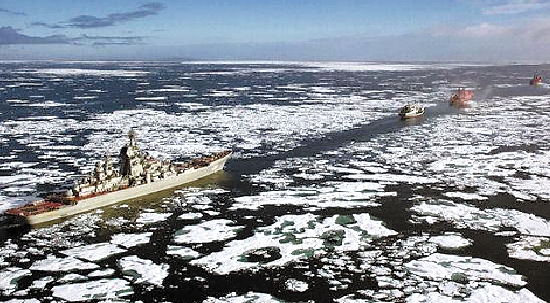 “彼得大帝”号导弹巡洋舰在破冰船的护送下,穿越浮冰覆盖着的北冰洋。