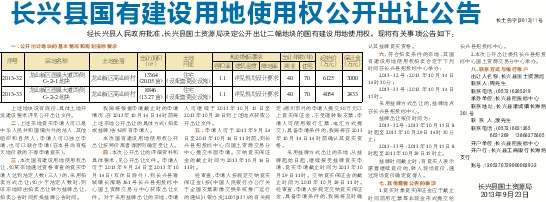 四、本次公开出让的详细资料和具体要求,见公开出让文件。申请人可于2013年9月24日至2013年10月14日(双休日除外),到长兴县雉城镇长海路361号长兴县招投标中心国土资源交易分中心获取出让文件。对于采用挂牌出让的宗地,申请人可继续于2013年10月15日至2013年10月29日到上述地点获取公开出让文件。
