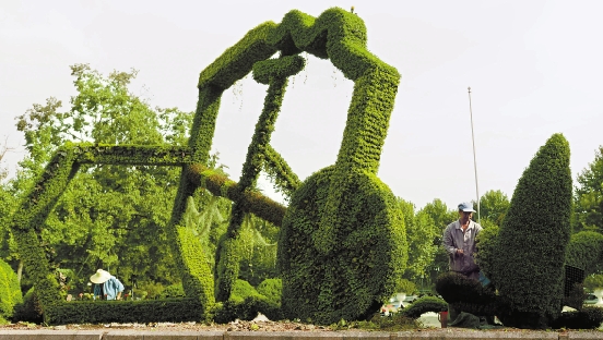 9月24日,杭州少年宫广场上国庆花坛正在搭建。今年少年宫广场的国庆花坛整体“瘦身”,造形更加简洁,用花量也比往年少。 本报记者 董旭明 摄