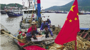 普陀渔民出海归,筐筐鱼虾载满舱。