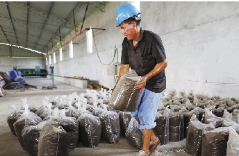 狐尾藻与虫粉搅拌而成的猪饲料。
