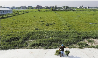 猪场边的废水池被郁郁葱葱的狐尾藻覆盖。