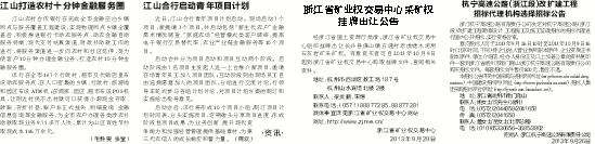 经浙江省国土资源厅批准,浙江省矿业权交易中心组织挂牌出让长兴县煤山镇五通村老虎塘水泥用石灰岩矿采矿权。有意竞买者可自2013年10月9日起到浙江省矿业权交易中心购取挂牌文件,查阅相关资料。