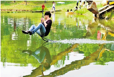 9月30日,中国美术学院象山校区,不时有人通过滑索跨越水面。这是美院学生以“桥”为主题设计的装置作业,整体由4部分组成,参与者可以通过滑索、挖土机挖斗、木质浴桶和栈桥来跨过湖面。 本报记者 徐彦 摄