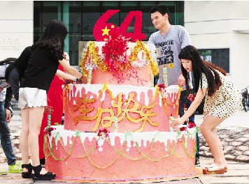 温州大学5名学生制作了手工大蛋糕迎国庆。 通讯员 吕卓环 记者 徐齐 摄