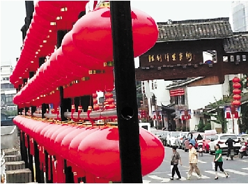 杭州胜利河美食街挂起鲜艳的红灯笼迎接祖国生日。 记者 包敦远 摄