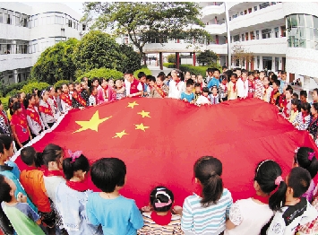海宁市丁桥镇新仓中心小学师生展现五星红旗。 海宁日报记者 王超英 摄