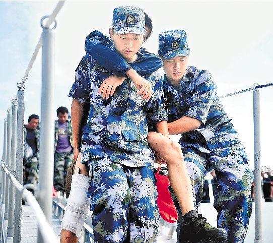 10月3日,268名西沙获救渔民乘坐军舰抵达三亚的南海舰队某基地军港码头,海上航行15个小时。图为一位子弟兵背着受伤渔民走下军舰。 新华社记者 张永峰 摄