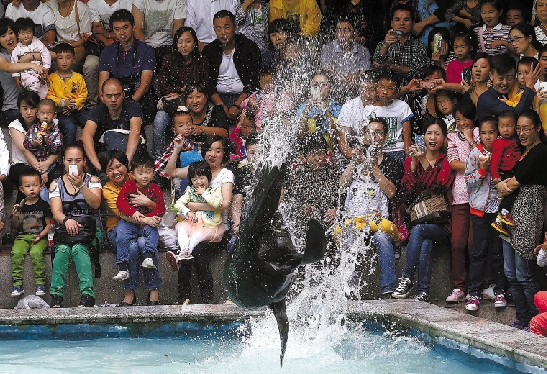 10月3日,杭州动物园内,家长带着孩子观看动物表演。国庆长假期间,西湖景区游人爆满,而动物园、植物园、博物馆则成为许多杭州人的游玩场所。 本报记者 林云龙 摄